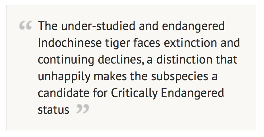 印度支那虎(Panthera tigris corbetti)研究不足,瀕臨滅絕,並持續下降,這壹區別不幸地使亞種成為極度瀕危的候選物種。泰國在其保護中扮演著至關重要的角色——在其他牧區國家,已知的繁殖種群很少。我們的工作重點放在了泰國的東發延幹雅森林綜合體(DPKY),這是壹個由五個保護區和聯合國教科文組織世界遺產地組成的組織,埃裏克和弗裏蘭基金會與泰國政府和Panthera合作,在那裏進行了壹項大規模的相機捕捉研究,以了解那裏的老虎是如何生存的。